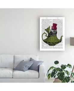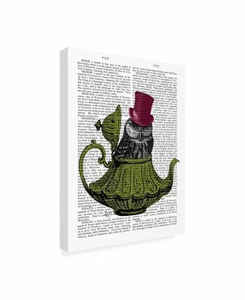 This ready to hang, gallery-wrapped art piece features a gray owl in a tea pot. Gallery-wrap is a method of wrapping an artist’s canvas around a hidden, wooden frame allowing for a frameless presentation.