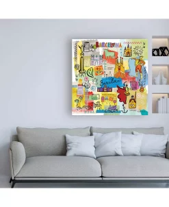 This ready to hang, gallery-wrapped art piece features a colorful collage of landmark images of Barcelona. Gallery-wrap is a method of wrapping an artist’s canvas around a hidden, wooden frame allowing for a frameless presentation.