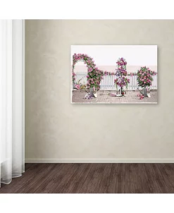 This ready to hang, gallery-wrapped art piece features pots of flowers in front of an arch and fence covered in flowers. Gallery wrap is a method of stretching an artist’s canvas so that the canvas wraps around the sides and is secured a hidden, wooden frame this allows for a frameless presentation of the finished painting.