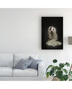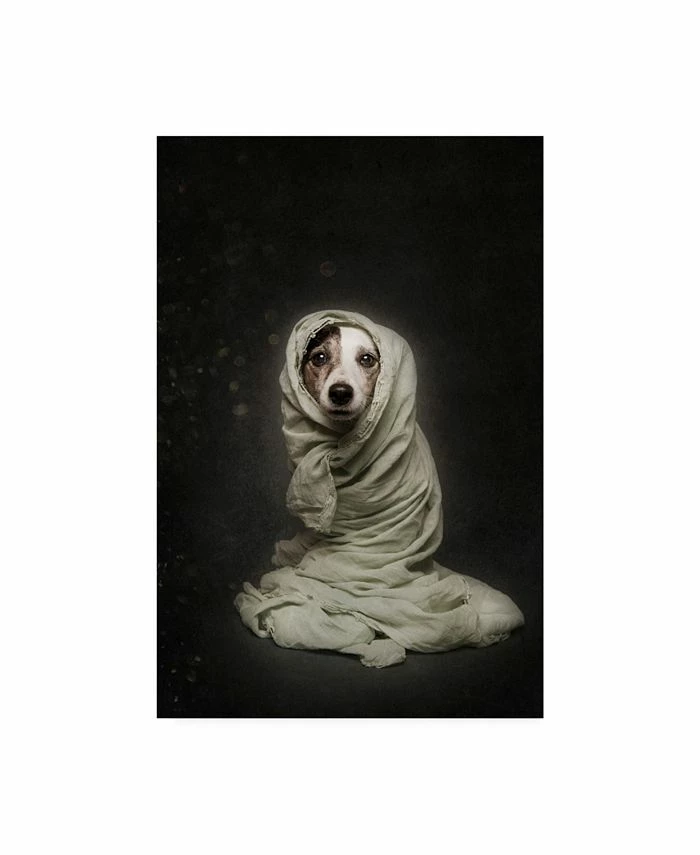 This ready to hang, gallery-wrapped art piece features a dog with a blanket wrapped around it. Gallery-wrap is a method of wrapping an artist’s canvas around a hidden, wooden frame allowing for a frameless presentation.