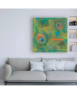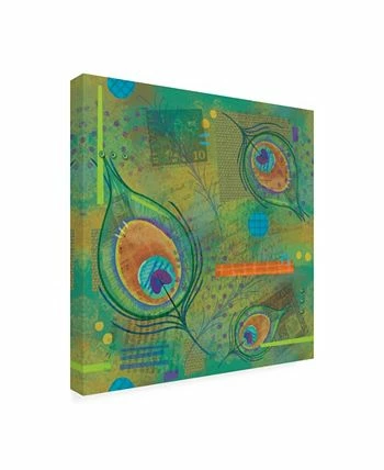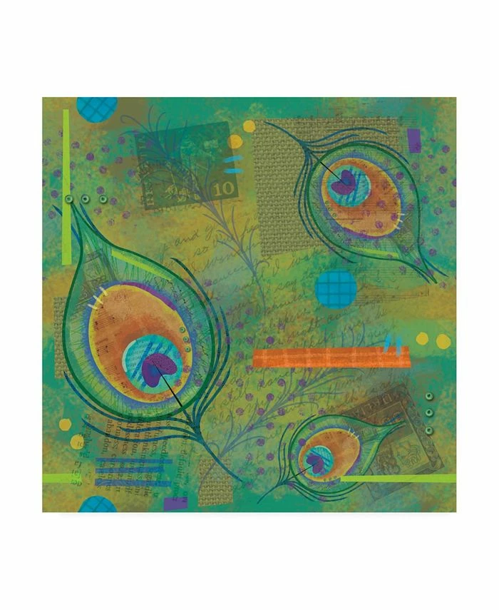This ready to hang, gallery-wrapped art piece features an abstract collage of peacock feathers on a patterned background. Gallery-wrap is a method of wrapping an artist’s canvas around a hidden, wooden frame allowing for a frameless presentation.
