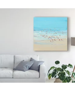 This ready to hang, gallery-wrapped art piece features a large group of people standing on a beach. Gallery-wrap is a method of wrapping an artist’s canvas around a hidden, wooden frame allowing for a frameless presentation.