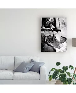 This ready to hang, gallery-wrapped art piece features two people holding a basket in a window. Gallery-wrap is a method of wrapping an artist’s canvas around a hidden, wooden frame allowing for a frameless presentation.