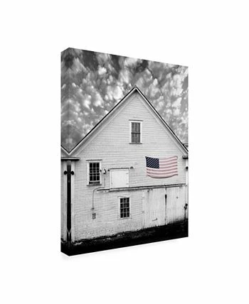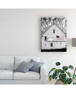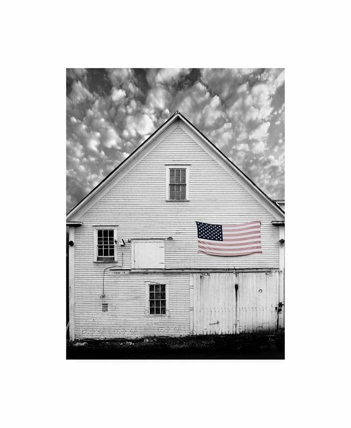 This ready to hang, gallery-wrapped art piece features an American flag hanging on a white building in the center of the frame. Gallery-wrap is a method of wrapping an artist’s canvas around a hidden, wooden frame allowing for a frameless presentation.