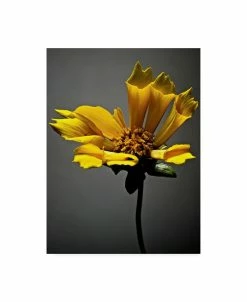 This ready to hang, gallery-wrapped art piece features a yellow flower in the center of the frame. Gallery-wrap is a method of wrapping an artist’s canvas around a hidden, wooden frame allowing for a frameless presentation.