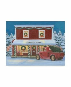 This ready to hang, gallery-wrapped art piece features a vintage red truck parked in front of a snowy general store with Christmas decorations. This art is gallery-wrapped, which allows for a frameless presentation.
