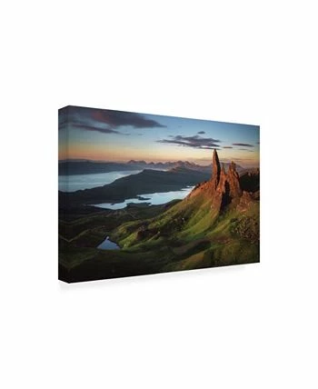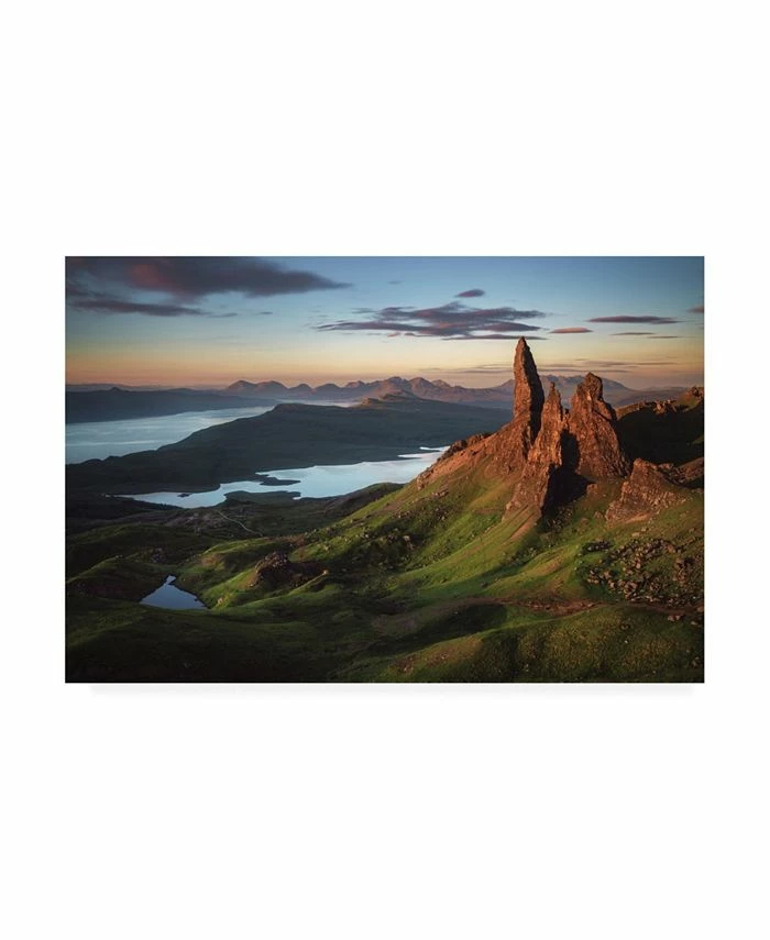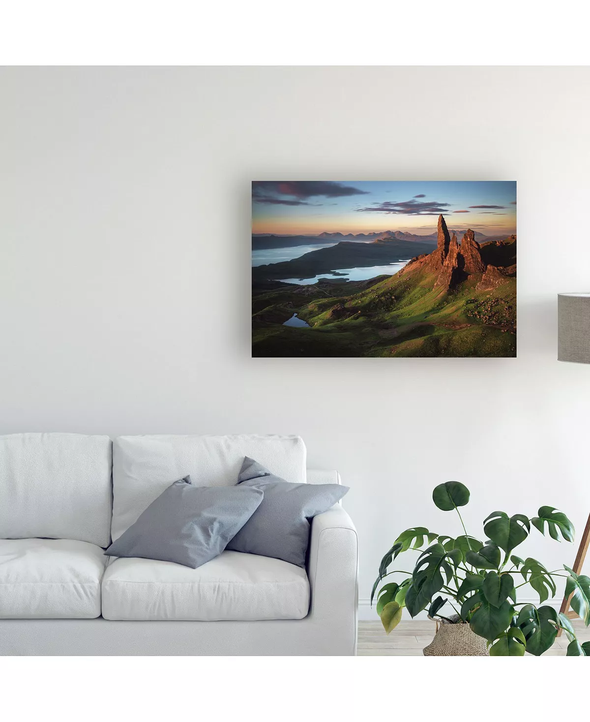 This ready to hang, gallery-wrapped art piece features a mountain landscape on the right side of a landscape. Gallery-wrap is a method of wrapping an artist’s canvas around a hidden, wooden frame allowing for a frameless presentation.