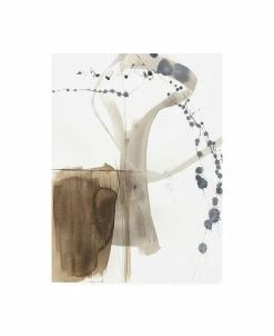 This ready to hang, gallery-wrapped art piece features gray and brown abstract paint over a white background. Gallery-wrap is a method of wrapping an artist’s canvas around a hidden, wooden frame allowing for a frameless presentation.