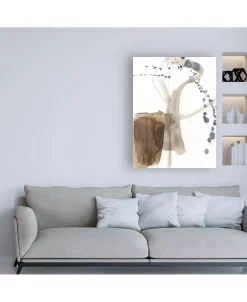 This ready to hang, gallery-wrapped art piece features gray and brown abstract paint over a white background. Gallery-wrap is a method of wrapping an artist’s canvas around a hidden, wooden frame allowing for a frameless presentation.