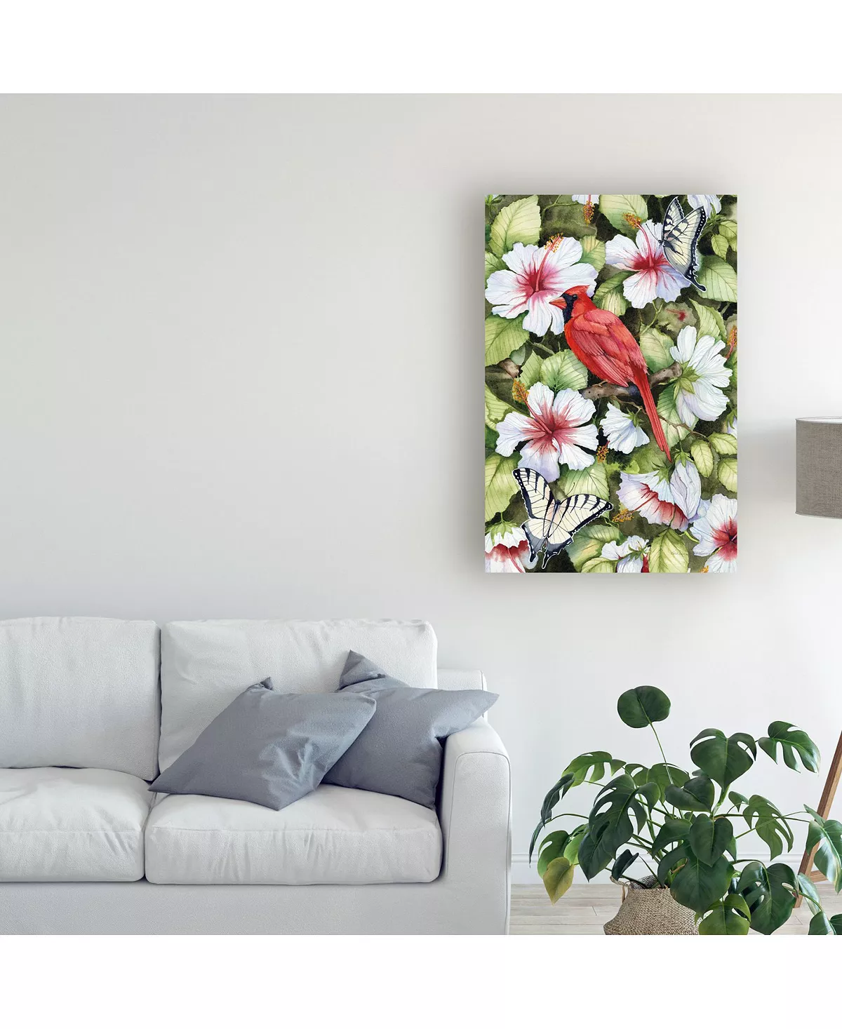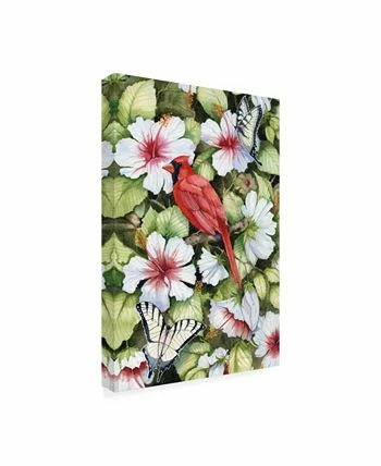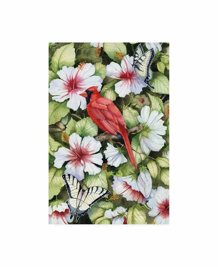 This ready to hang, gallery-wrapped art piece features butterflies and a cardinal perched among white and red flowers. Gallery-wrap is a method of wrapping an artist’s canvas around a hidden, wooden frame allowing for a frameless presentation.