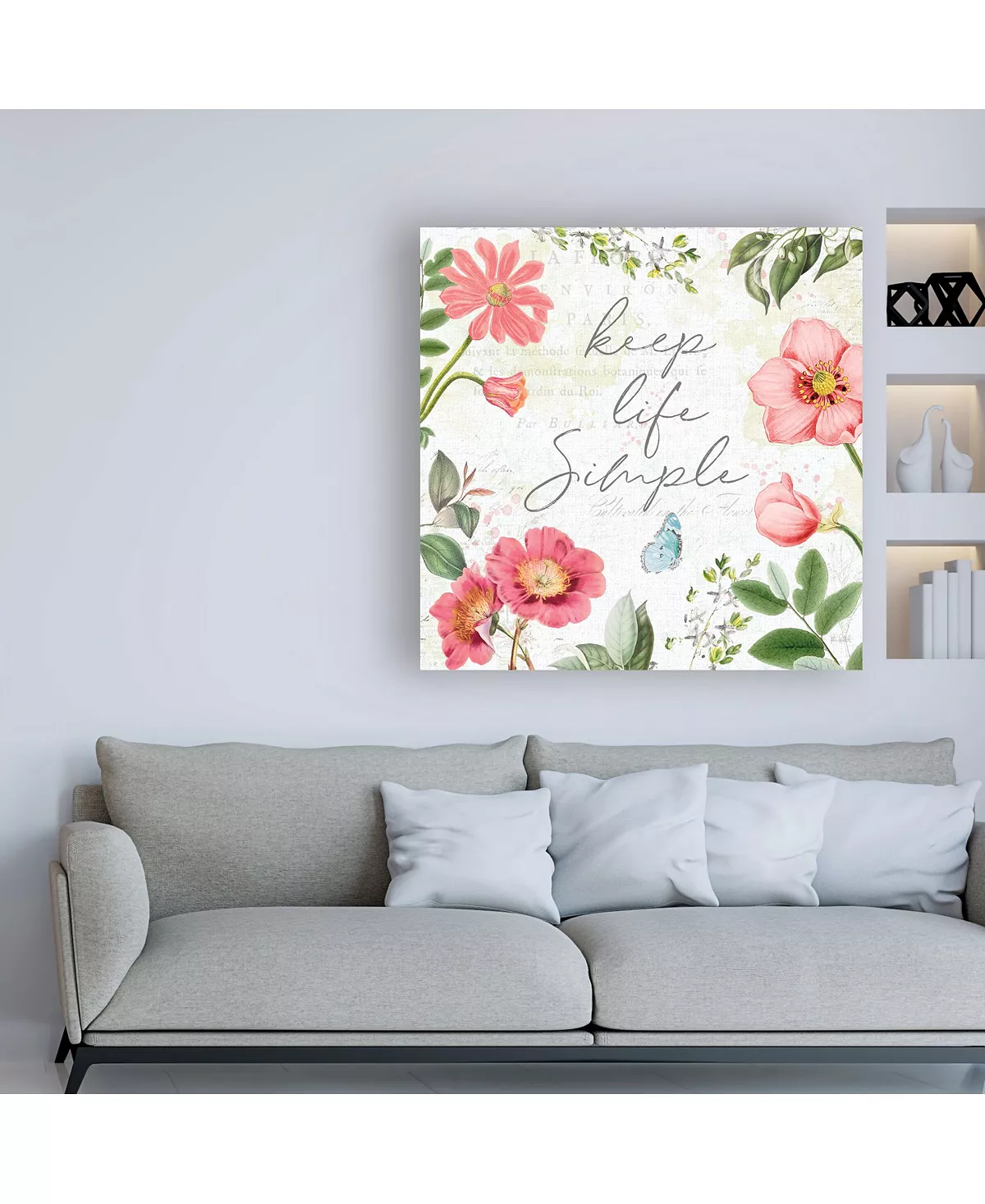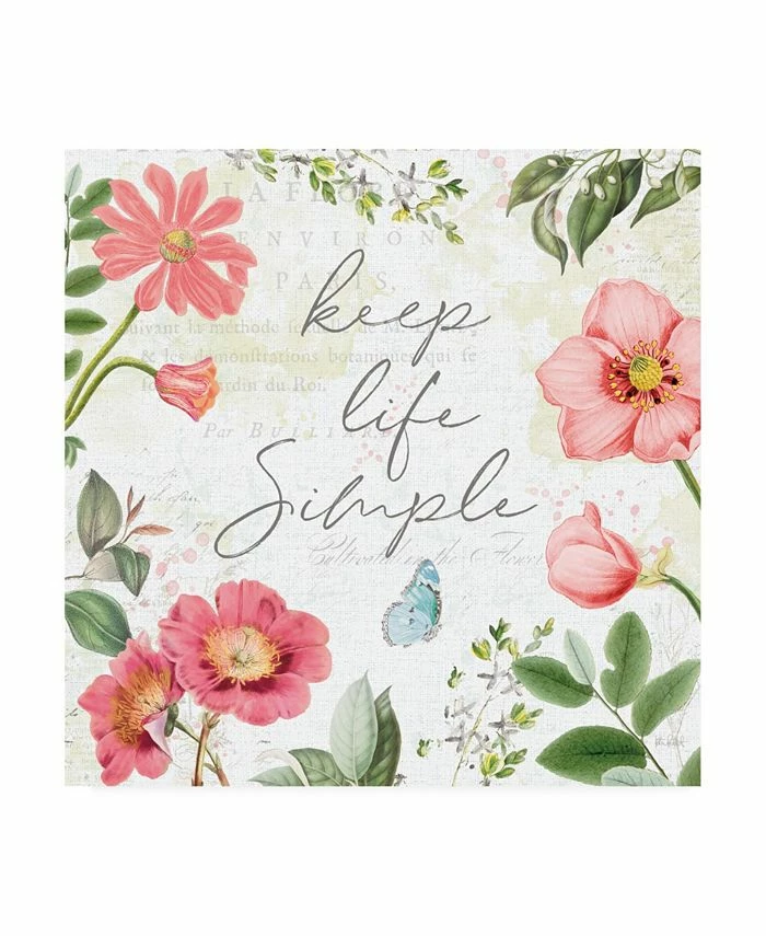 This ready to hang, gallery-wrapped art piece features “keep life simple” text with flowers and a butterfly. Gallery-wrap is a method of wrapping an artist’s canvas around a hidden, wooden frame allowing for a frameless presentation.
