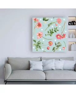This ready to hang, gallery-wrapped art piece features a scattered collage of pink flowers and greenery. Gallery-wrap is a method of wrapping an artist’s canvas around a hidden, wooden frame allowing for a frameless presentation.