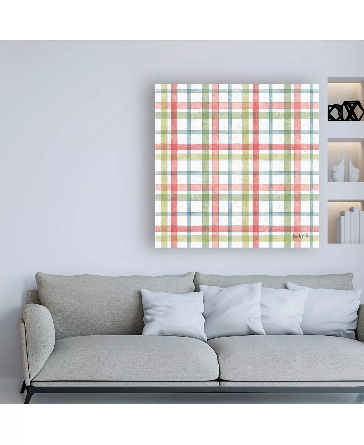 This ready to hang, gallery-wrapped art piece features a plaid patterned design in pastel colors. Gallery-wrap is a method of wrapping an artist’s canvas around a hidden, wooden frame allowing for a frameless presentation.