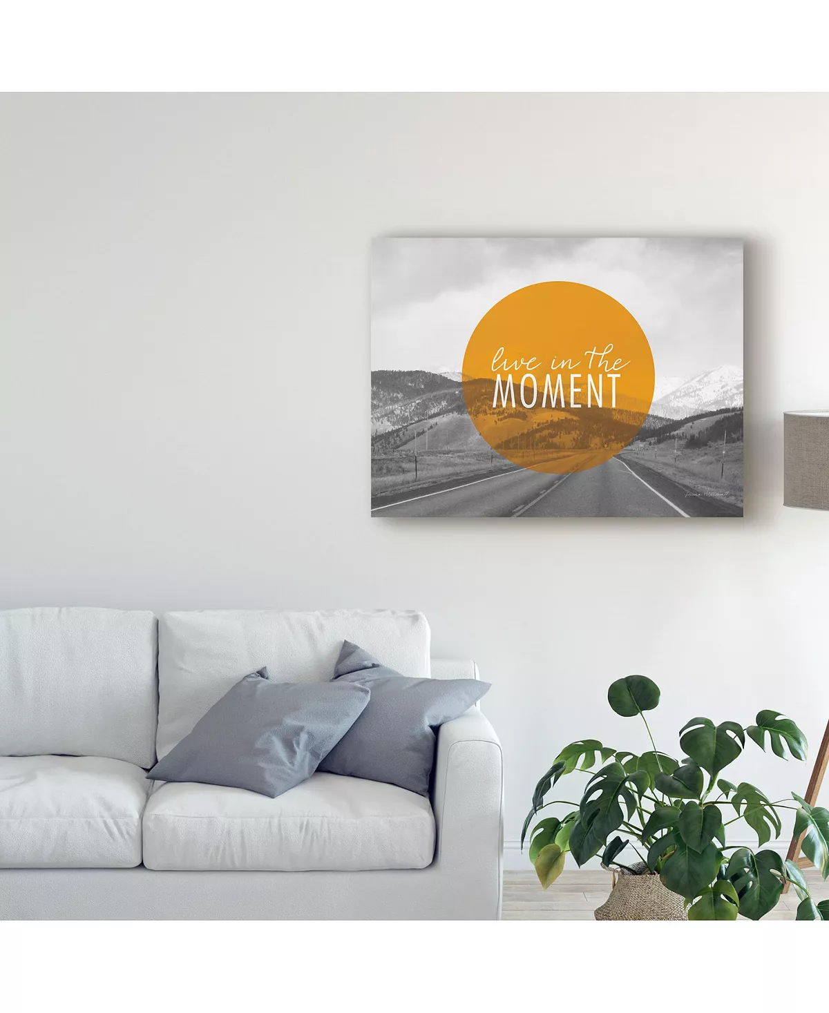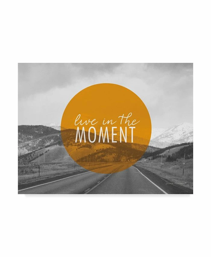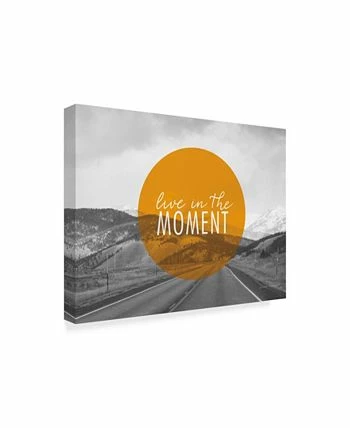 This ready to hang, gallery-wrapped art piece features the phrase “Live in the Moment” in an orange circle over a black and white image of a mountain road. This art is gallery-wrapped, which allows for a frameless presentation.