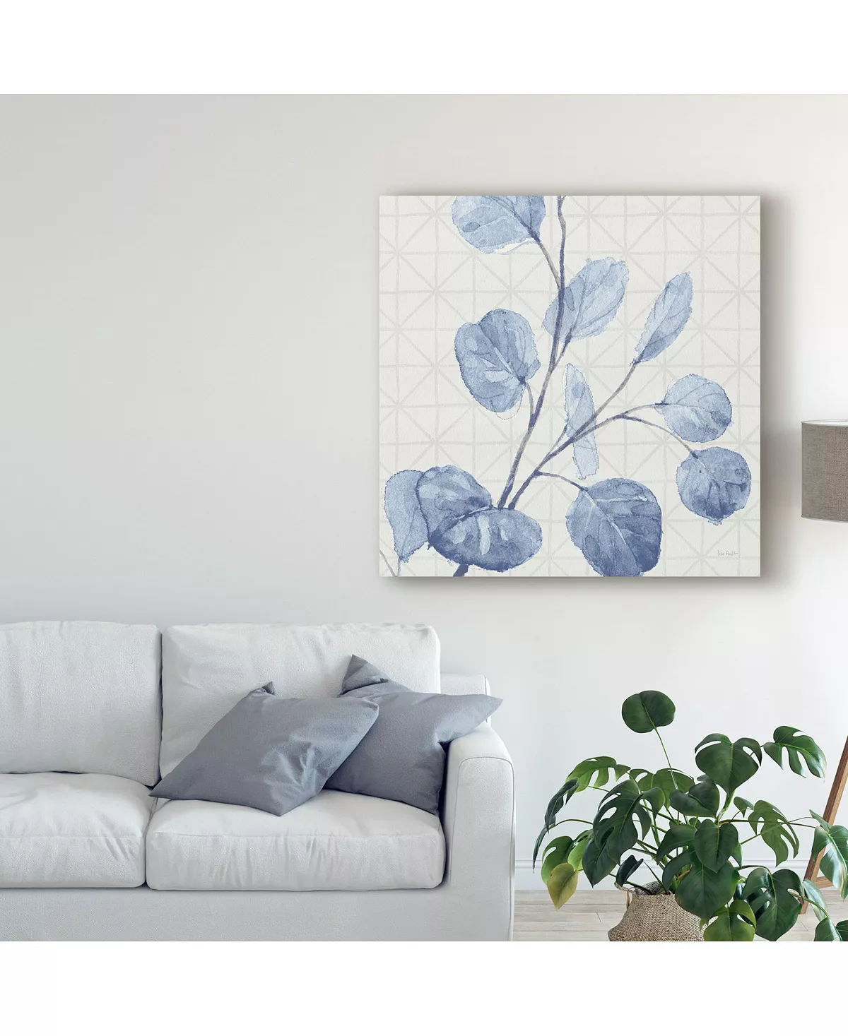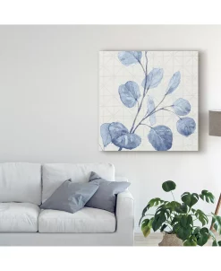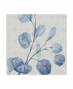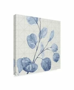 This ready to hang, gallery-wrapped art piece features blue leaves painted over a faint geometric pattern. Gallery-wrap is a method of wrapping an artist’s canvas around a hidden, wooden frame allowing for a frameless presentation.