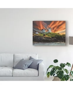 This ready to hang, gallery-wrapped art piece features a lighthouse on a grassy ocean cliff under an orange-streaked evening sky. Gallery-wrap is a method of wrapping an artist’s canvas around a hidden, wooden frame allowing for a frameless presentation.