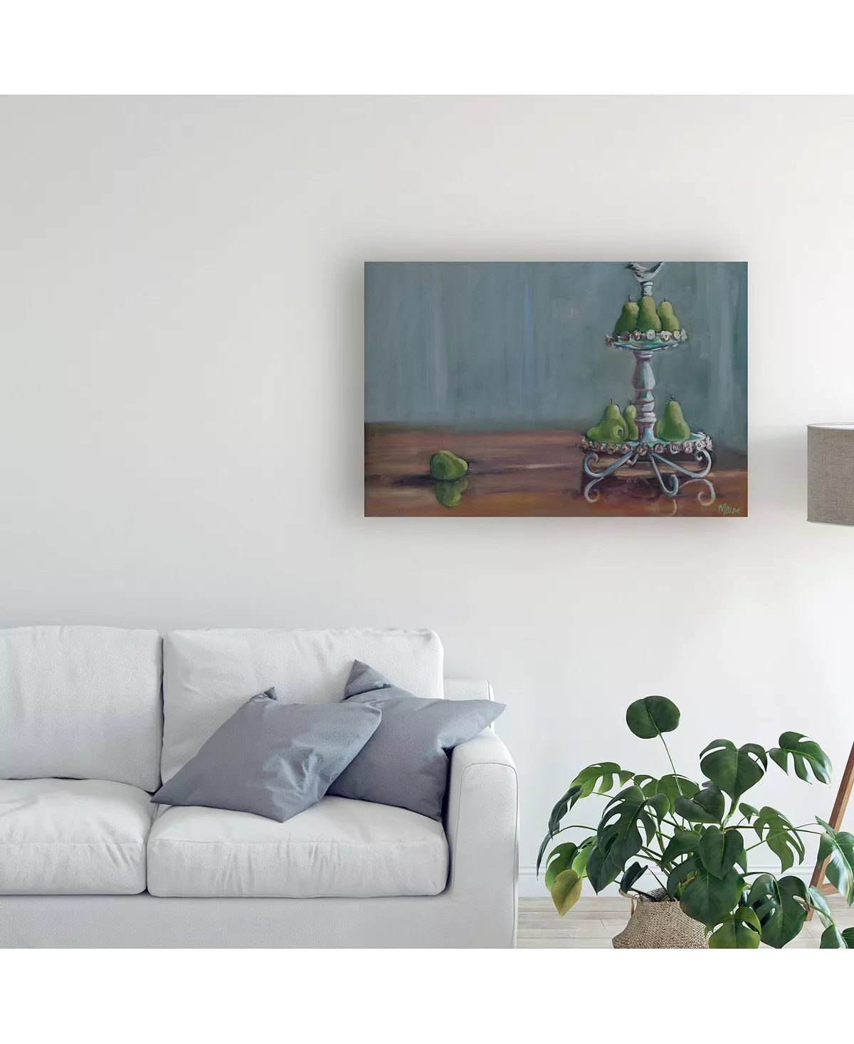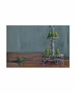 This ready to hang, gallery-wrapped art piece features pears in a still life on the right side of the frame. Gallery-wrap is a method of wrapping an artist’s canvas around a hidden, wooden frame allowing for a frameless presentation.