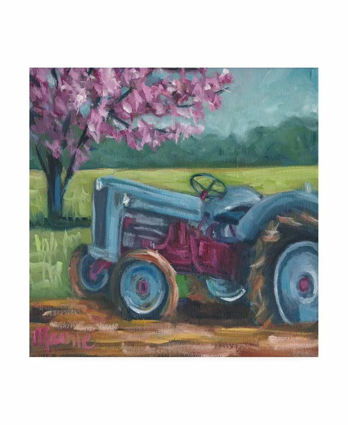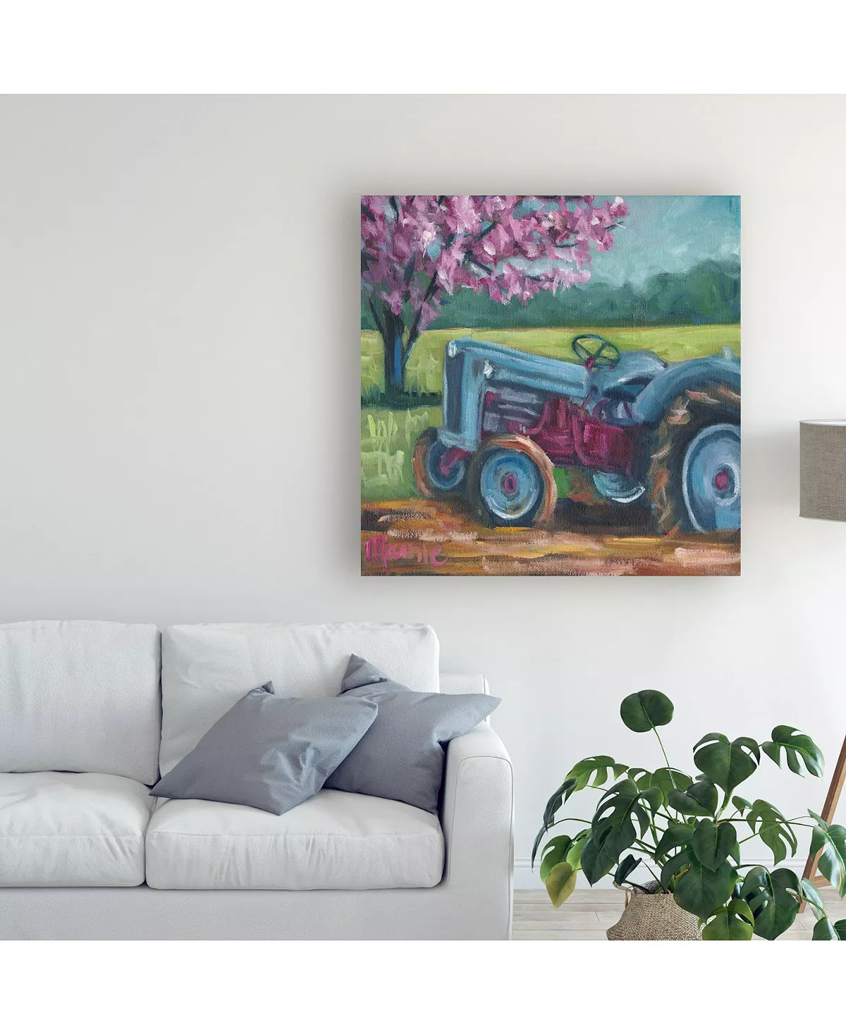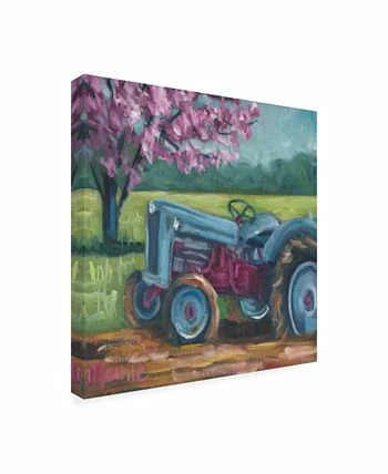 This ready to hang, gallery-wrapped art piece features a blue and red tractor in the center of the frame. Gallery-wrap is a method of wrapping an artist’s canvas around a hidden, wooden frame allowing for a frameless presentation.