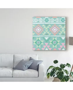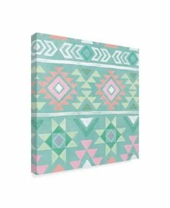 This ready to hang, gallery-wrapped art piece features a geometric Southwestern pattern in shades of green, teal, white and pink. Gallery-wrap is a method of wrapping an artist’s canvas around a hidden, wooden frame allowing for a frameless presentation.