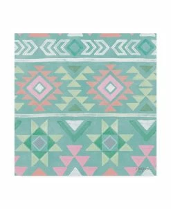 This ready to hang, gallery-wrapped art piece features a geometric Southwestern pattern in shades of green, teal, white and pink. Gallery-wrap is a method of wrapping an artist’s canvas around a hidden, wooden frame allowing for a frameless presentation.
