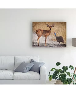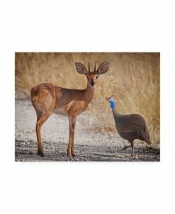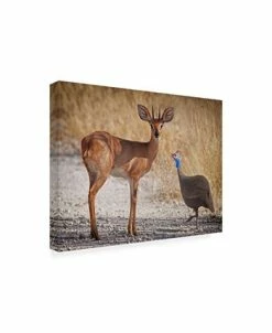This ready to hang, gallery-wrapped art piece features an antelope standing next to a bird. Gallery-wrap is a method of wrapping an artist’s canvas around a hidden, wooden frame allowing for a frameless presentation.