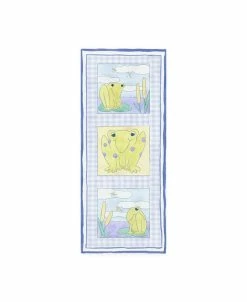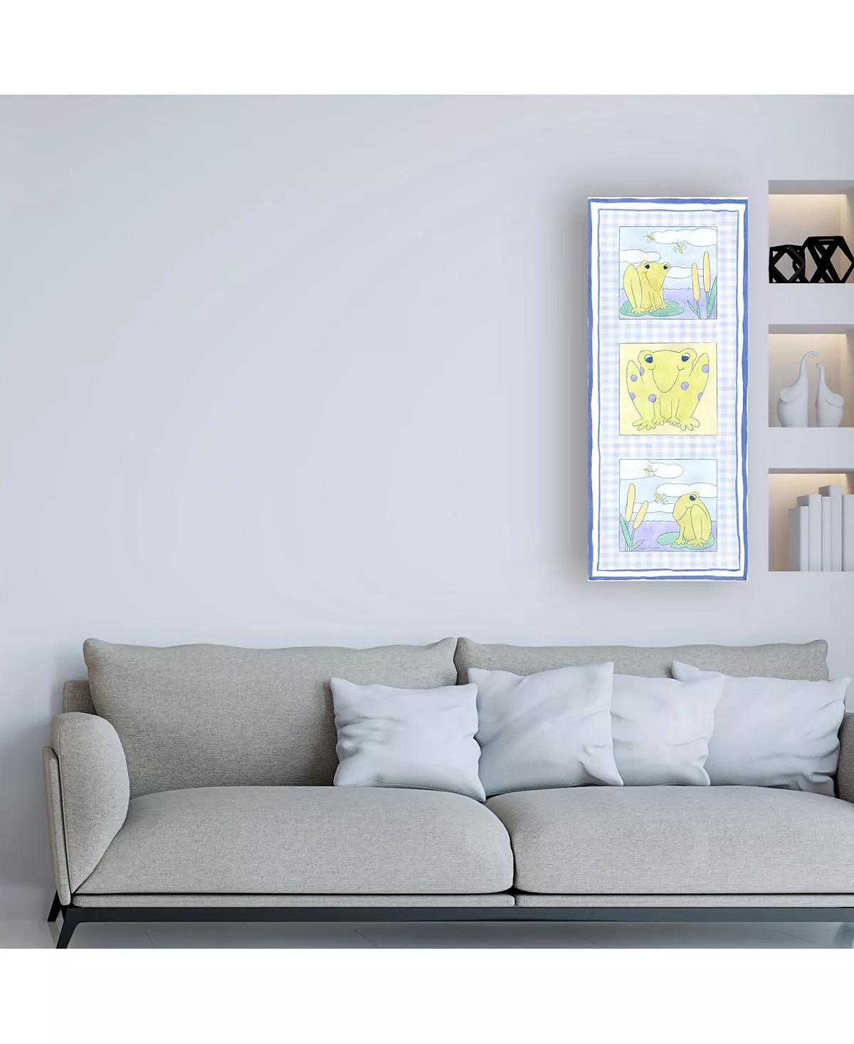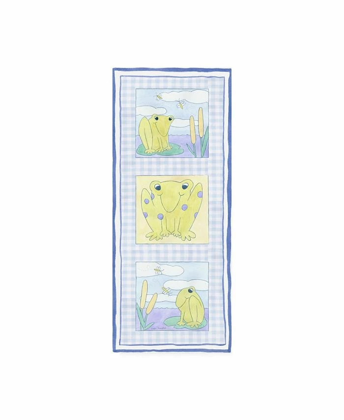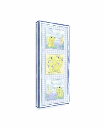 This ready to hang, gallery-wrapped art piece features green frogs in three panels on a blue background. Gallery-wrap is a method of wrapping an artist’s canvas around a hidden, wooden frame allowing for a frameless presentation.