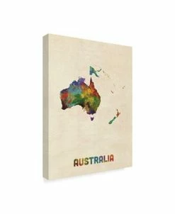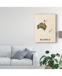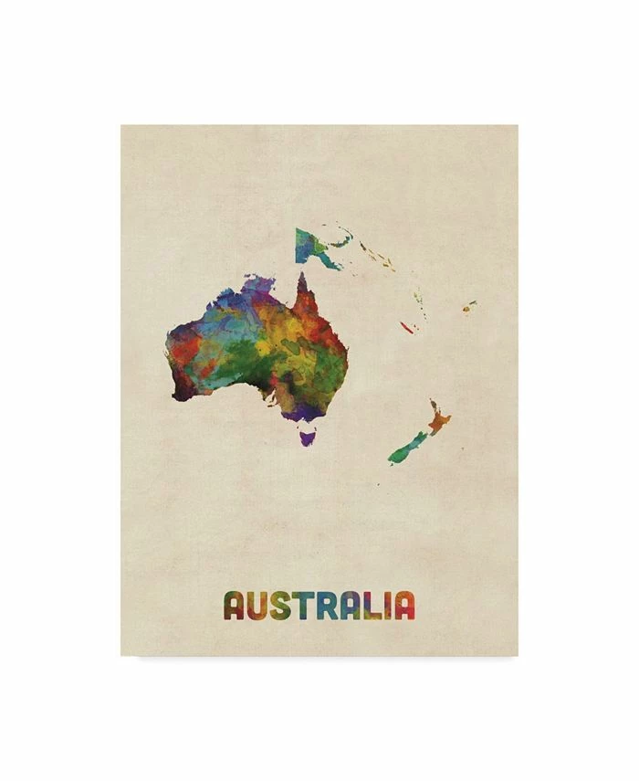 This ready to hang, gallery-wrapped art piece features a colorful map of Australia on a beige background. Gallery-wrap is a method of wrapping an artist’s canvas around a hidden, wooden frame allowing for a frameless presentation.