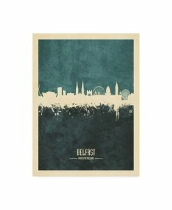 This ready to hang, gallery-wrapped art piece features a textured cityscape of Belfast Northern Ireland over a colored background Gallery-wrap is a method of wrapping an artist’s canvas around a hidden, wooden frame allowing for a frameless presentation.