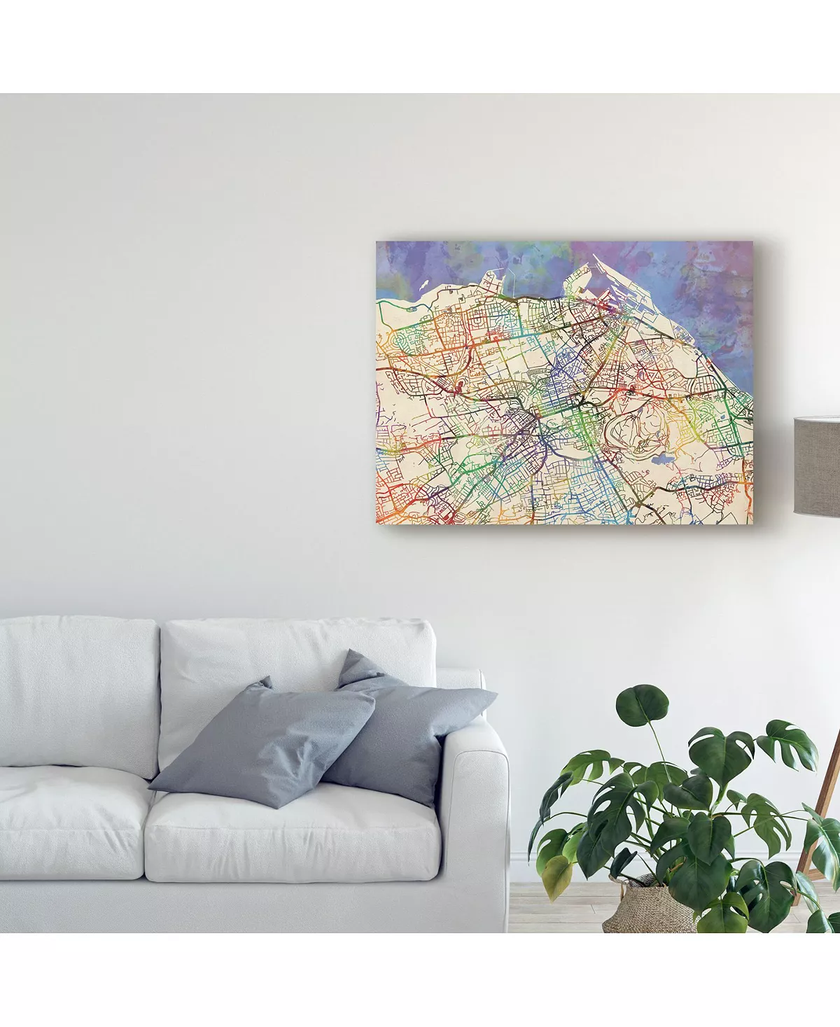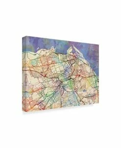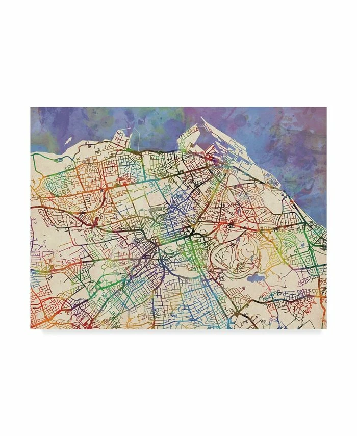 This ready to hang, gallery-wrapped art piece features a colorful street map of Edinburgh. Gallery-wrap is a method of wrapping an artist’s canvas around a hidden, wooden frame allowing for a frameless presentation.