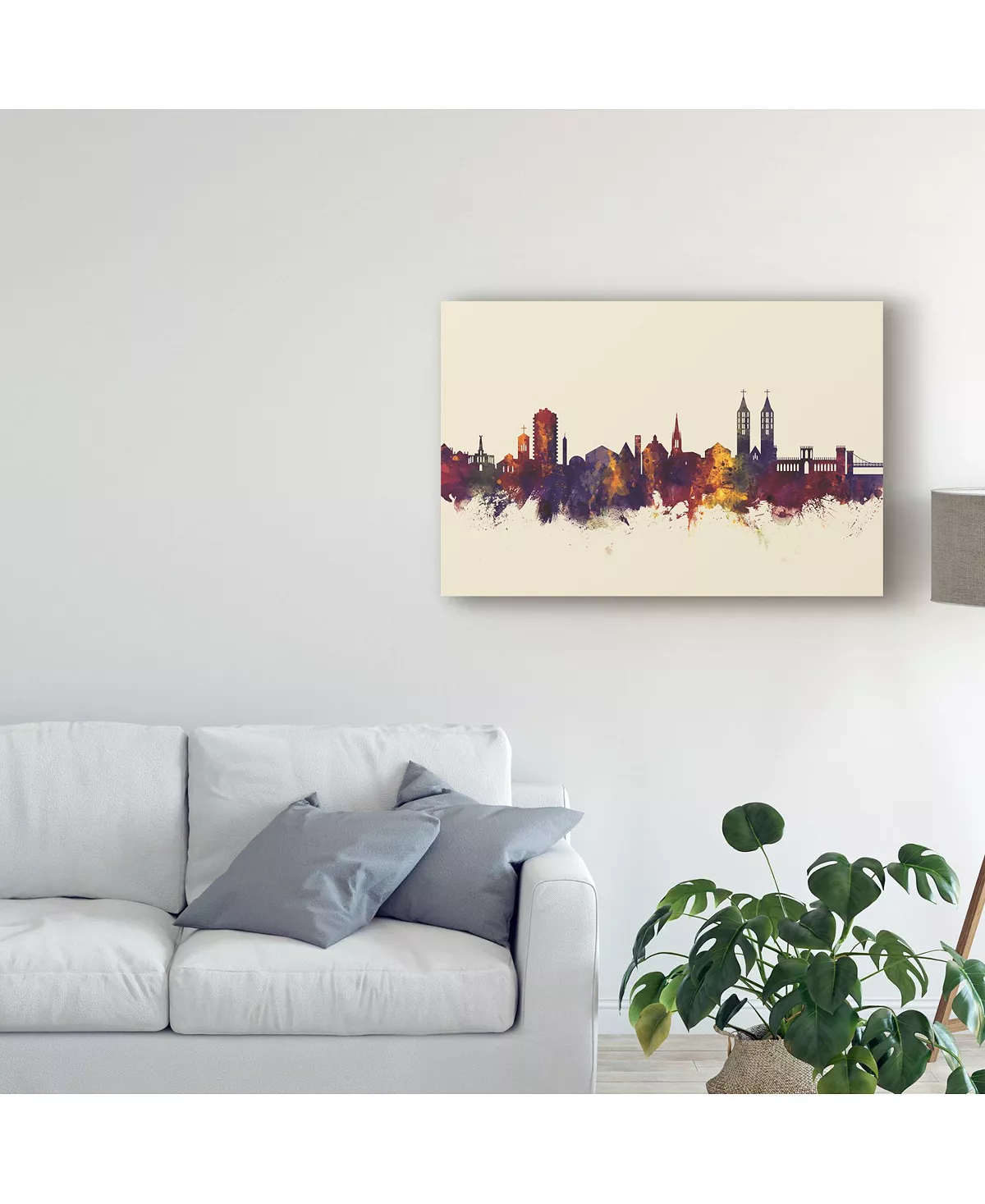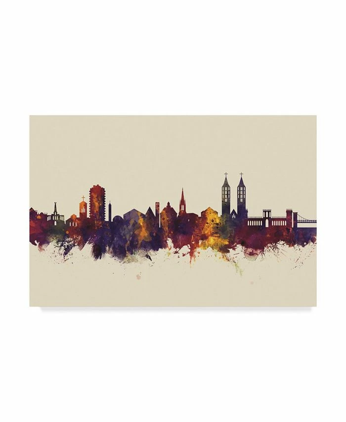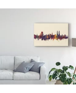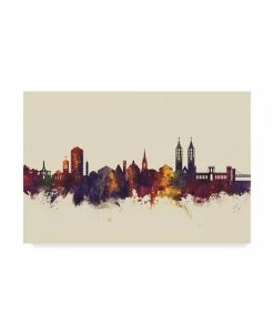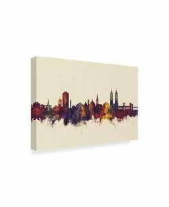 This ready to hang, gallery-wrapped art piece features the skyline of Kassel, Germany in deep, muted colors on a beige background. Gallery-wrap is a method of wrapping an artist’s canvas around a hidden, wooden frame allowing for a frameless presentation.