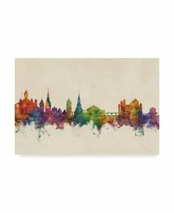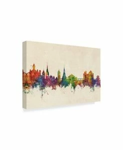 This ready to hang, gallery-wrapped art piece features the skyline of Schaffhausen, Switzerland in bright colors on a beige background. This art is gallery-wrapped, which allows for a frameless presentation.