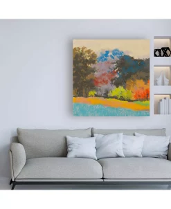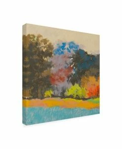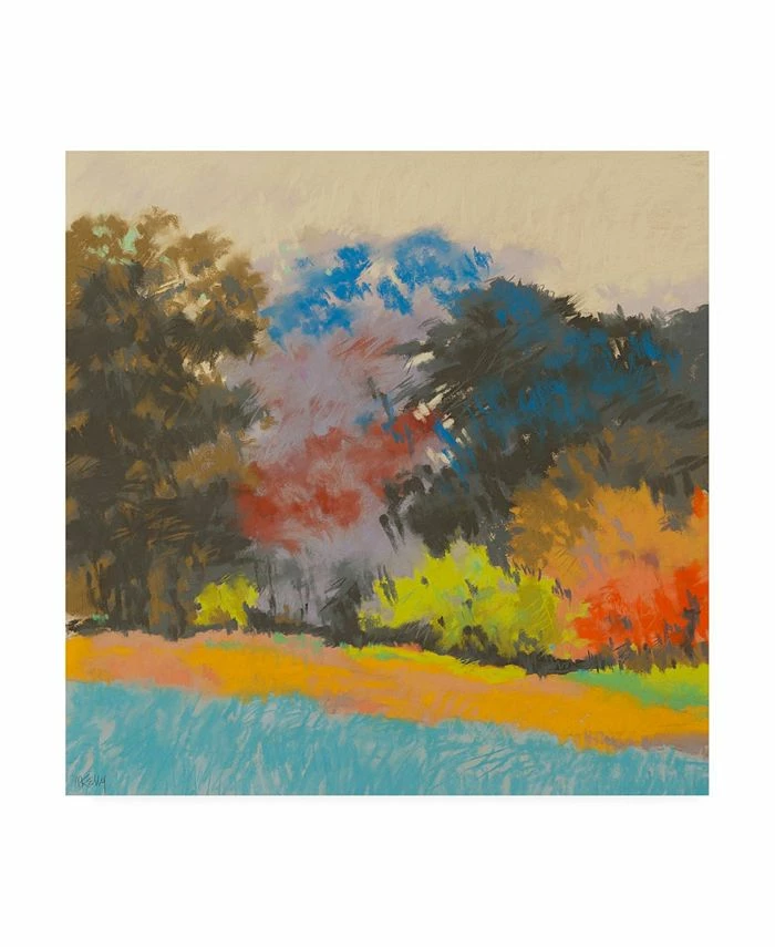 This ready to hang, gallery-wrapped art piece features colorful trees under a beige sky. Gallery-wrap is a method of wrapping an artist’s canvas around a hidden, wooden frame allowing for a frameless presentation.