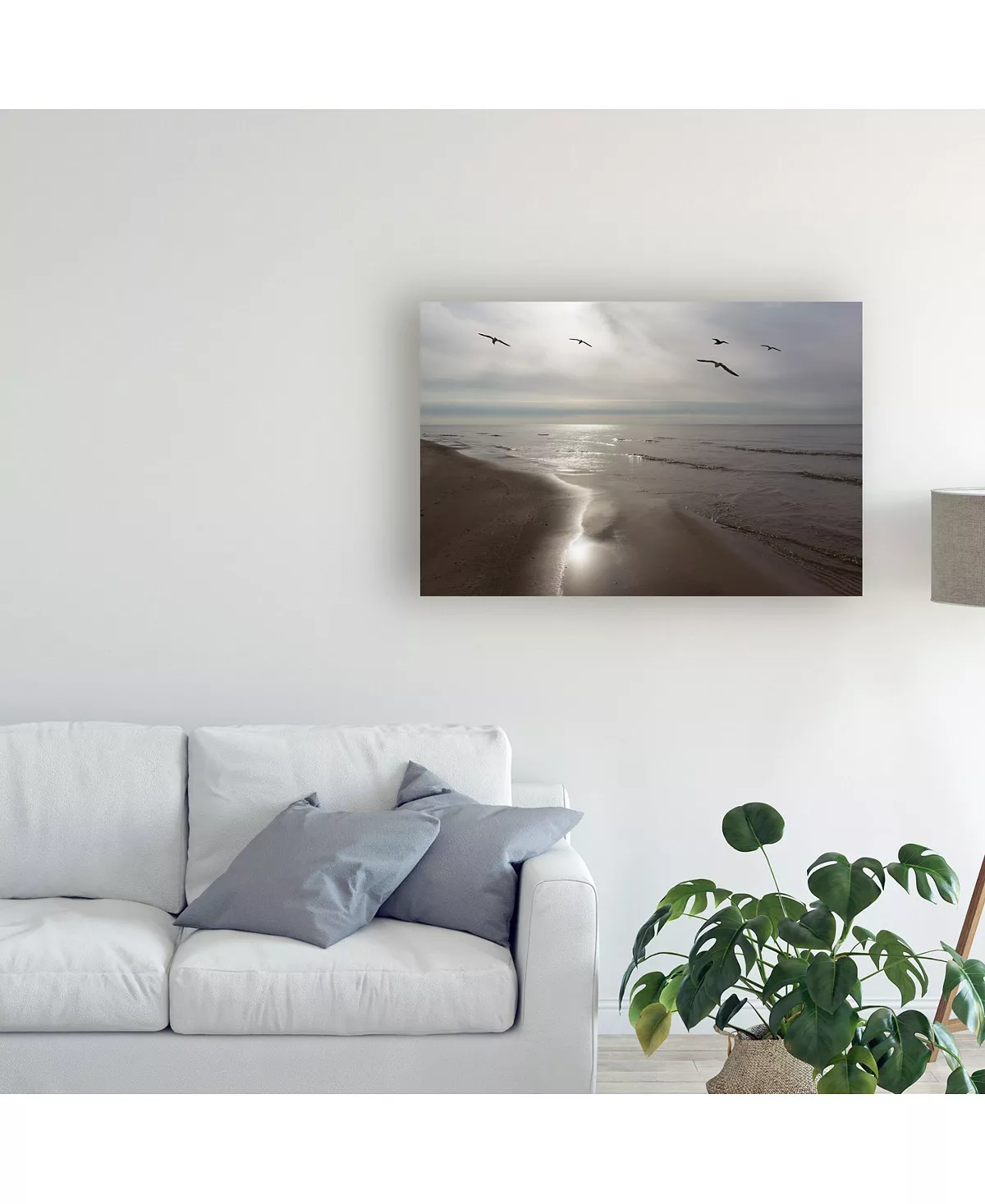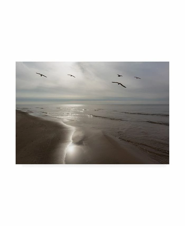 This ready to hang, gallery-wrapped art piece features a coastline under a cloudy sky. Gallery-wrap is a method of wrapping an artist’s canvas around a hidden, wooden frame allowing for a frameless presentation.