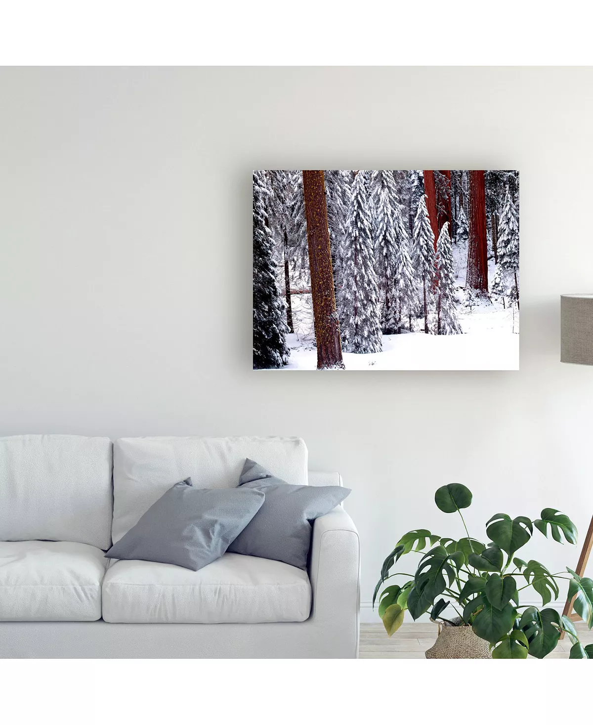 This ready to hang, gallery-wrapped art piece features trees in a forest covered in snow. Gallery-wrap is a method of wrapping an artist’s canvas around a hidden, wooden frame allowing for a frameless presentation.