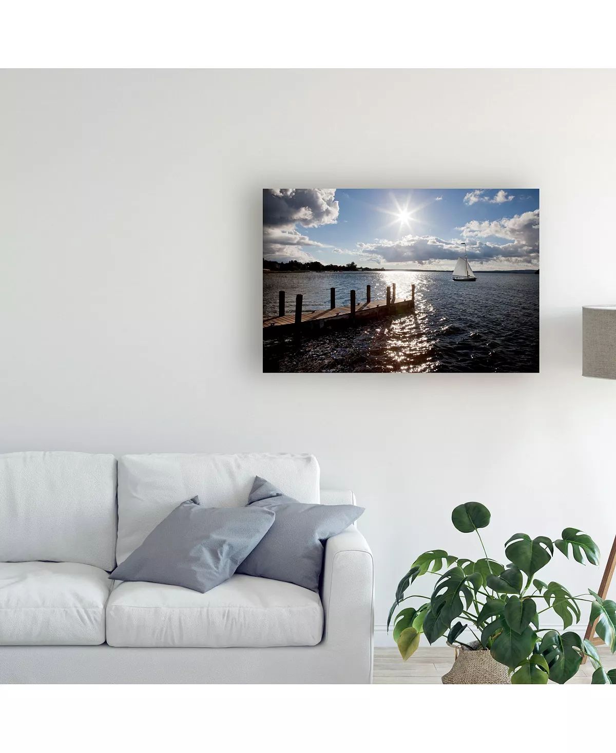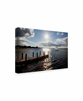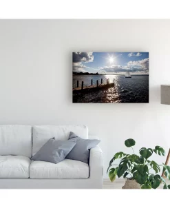 This ready to hang, gallery-wrapped art piece features a pier on the left side of the frame. Gallery-wrap is a method of wrapping an artist’s canvas around a hidden, wooden frame allowing for a frameless presentation.