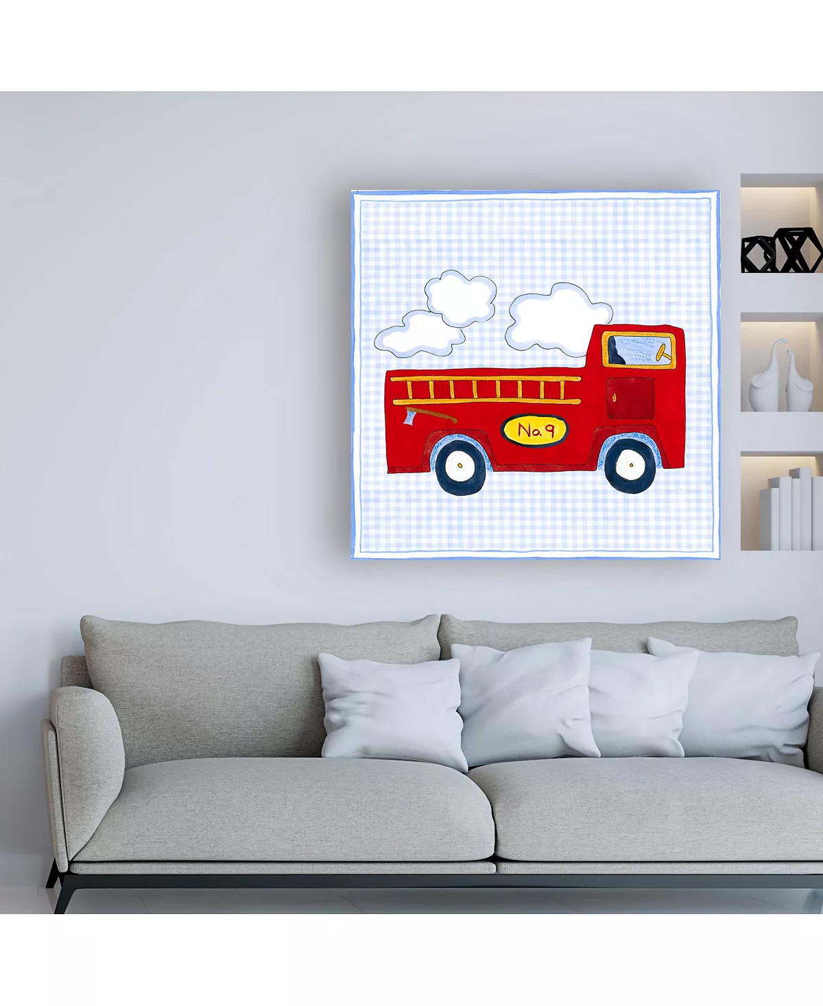 This ready to hang, gallery-wrapped art piece features a red firetruck in the center of the frame. Gallery-wrap is a method of wrapping an artist’s canvas around a hidden, wooden frame allowing for a frameless presentation.