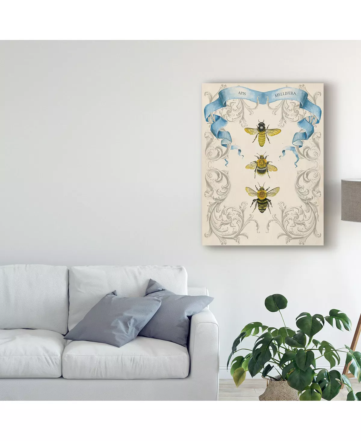This ready to hang, gallery-wrapped art piece features three yellow bees in the center of the frame. Gallery-wrap is a method of wrapping an artist’s canvas around a hidden, wooden frame allowing for a frameless presentation.