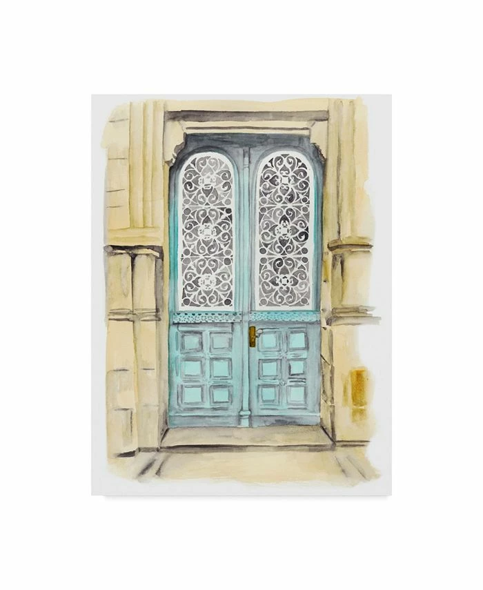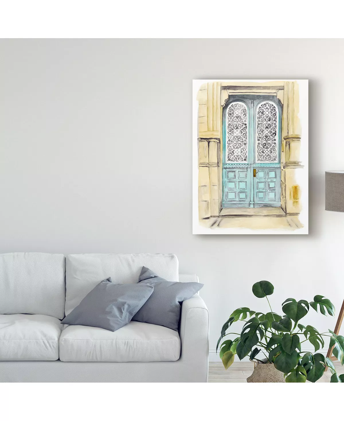 This ready to hang, gallery-wrapped art piece features a blue door in the center of the frame. Gallery-wrap is a method of wrapping an artist’s canvas around a hidden, wooden frame allowing for a frameless presentation.