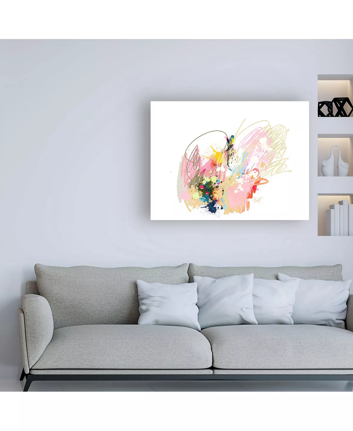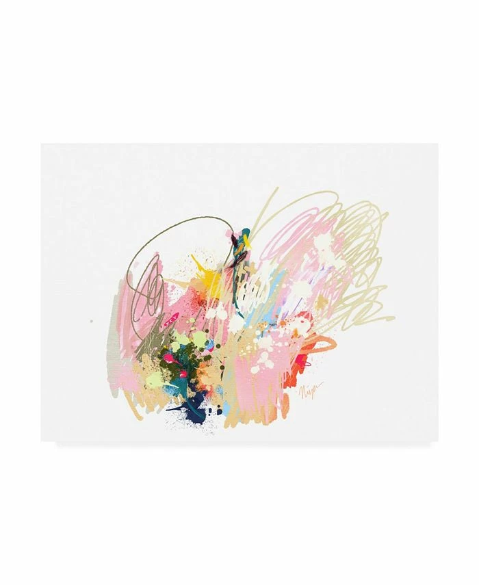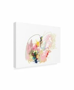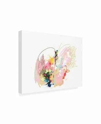 This ready to hang, gallery-wrapped art piece features pink and yellow paint splattered in the center of the frame. Gallery-wrap is a method of wrapping an artist’s canvas around a hidden, wooden frame allowing for a frameless presentation.