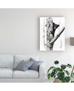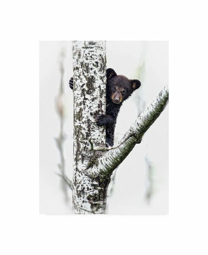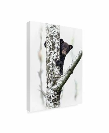 This ready to hang, gallery-wrapped art piece features a bear looking around a tree in an illustration. Gallery-wrap is a method of wrapping an artist’s canvas around a hidden, wooden frame allowing for a frameless presentation.