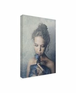 This ready to hang, gallery-wrapped art piece features a portrait of a woman with a blue flower. Gallery-wrap is a method of wrapping an artist’s canvas around a hidden, wooden frame allowing for a frameless presentation.