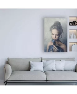 This ready to hang, gallery-wrapped art piece features a portrait of a woman with a blue flower. Gallery-wrap is a method of wrapping an artist’s canvas around a hidden, wooden frame allowing for a frameless presentation.