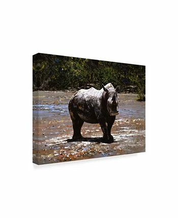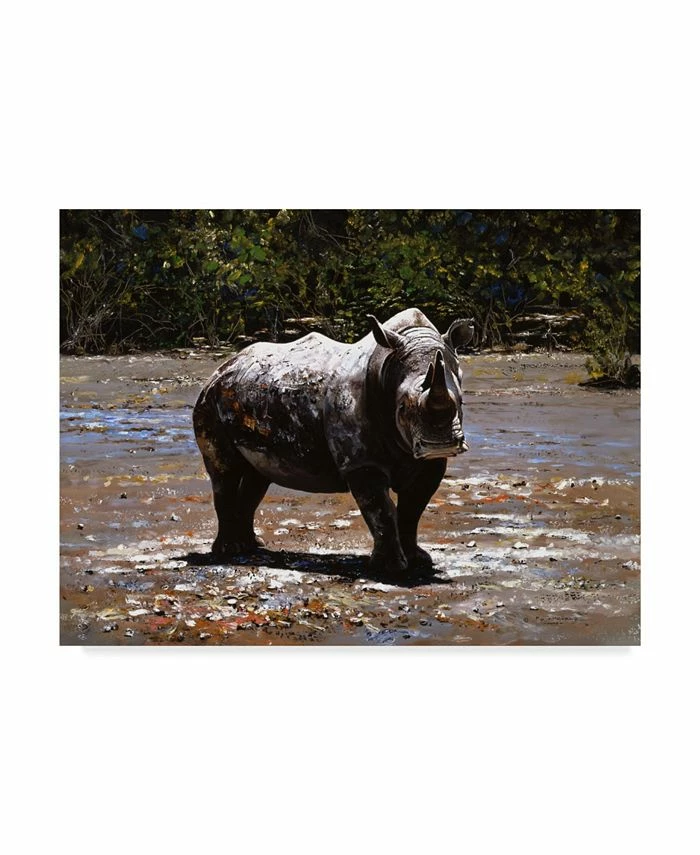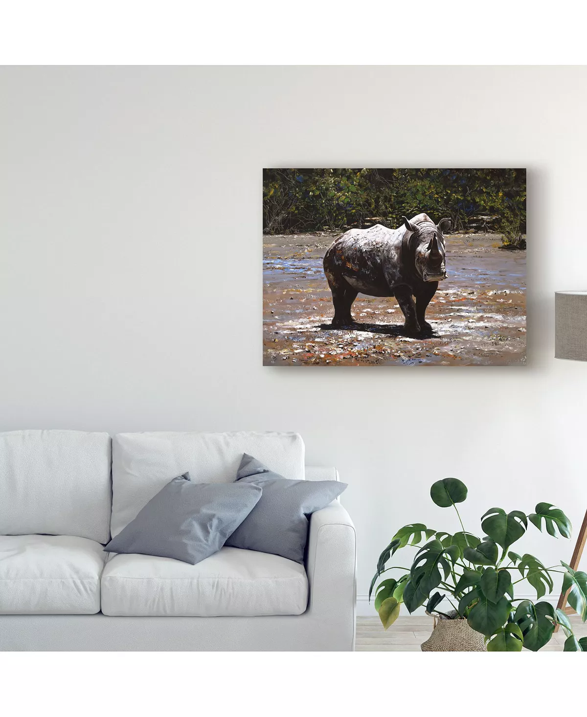 This ready to hang, gallery-wrapped art piece features a rhino standing in the center of the frame. Gallery-wrap is a method of wrapping an artist’s canvas around a hidden, wooden frame allowing for a frameless presentation.
