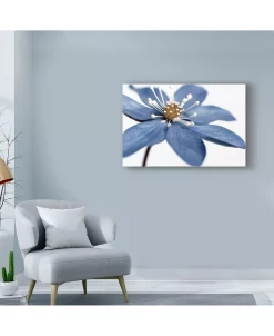 This ready to hang, gallery-wrapped art piece features a blue flower on the left side of a white scene. Gallery wrap is a method of stretching an artist’s canvas so that the canvas wraps around the sides and is secured a hidden, wooden frame this allows for a frameless presentation of the finished painting.