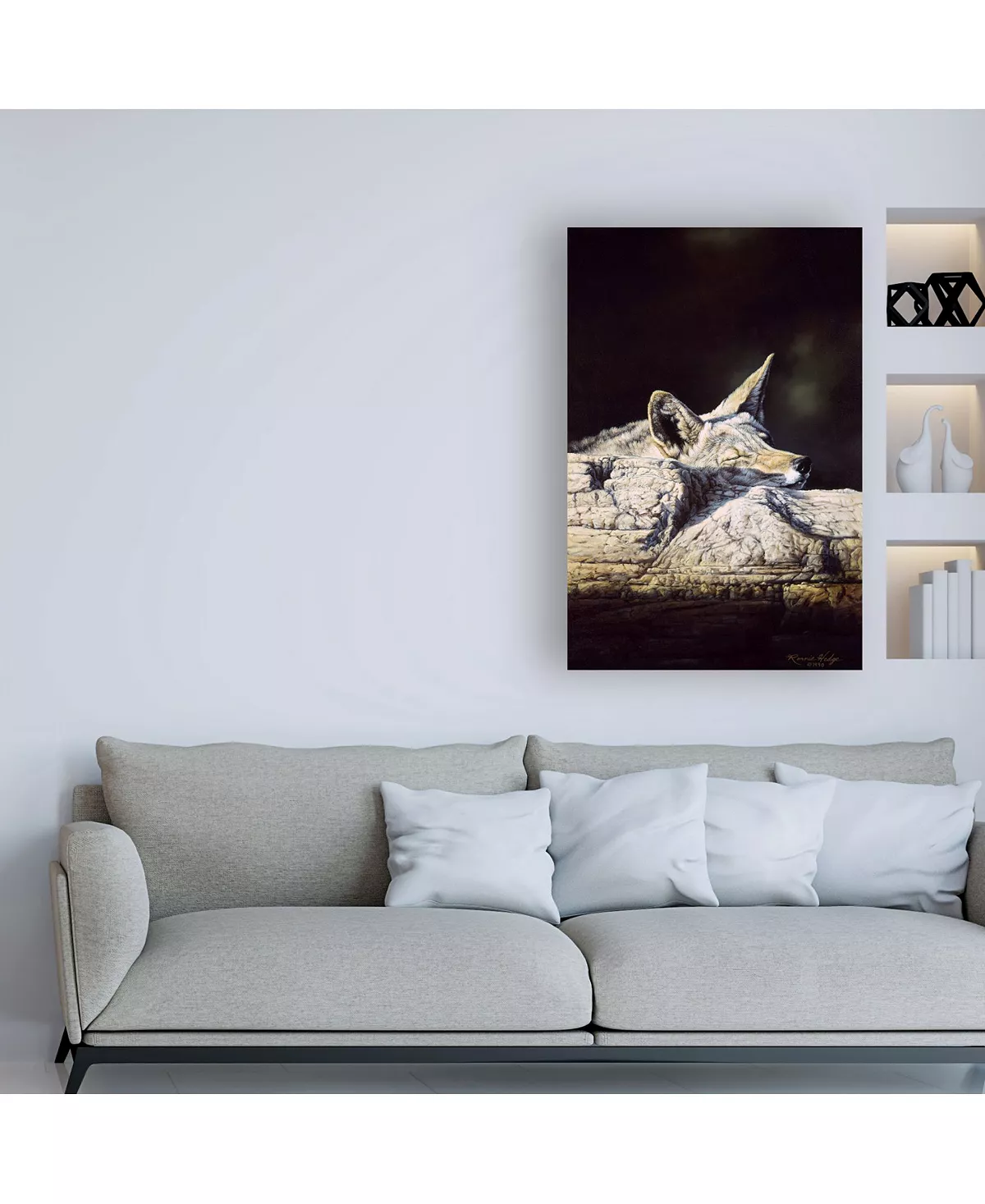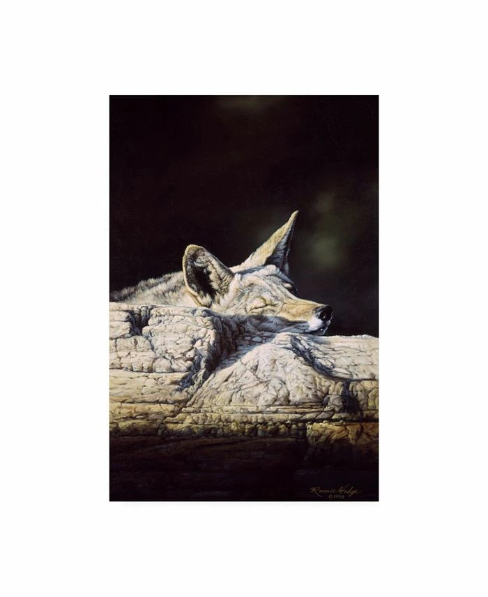 This ready to hang, gallery-wrapped art piece features a wolf sleeping on rocks. Gallery-wrap is a method of wrapping an artist’s canvas around a hidden, wooden frame allowing for a frameless presentation.
