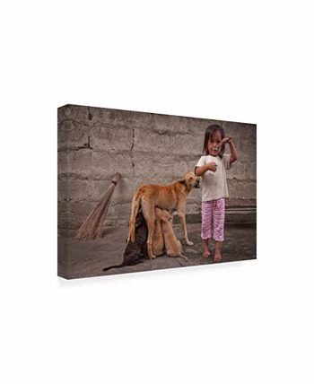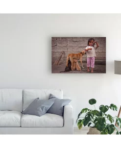 This ready to hang, gallery-wrapped art piece features a child standing in front of a family of dogs. Gallery-wrap is a method of wrapping an artist’s canvas around a hidden, wooden frame allowing for a frameless presentation.
