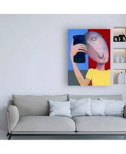 This ready to hang, gallery-wrapped art piece features a colorful modern abstract of a man taking a selfie. Gallery-wrap is a method of wrapping an artist’s canvas around a hidden, wooden frame allowing for a frameless presentation.