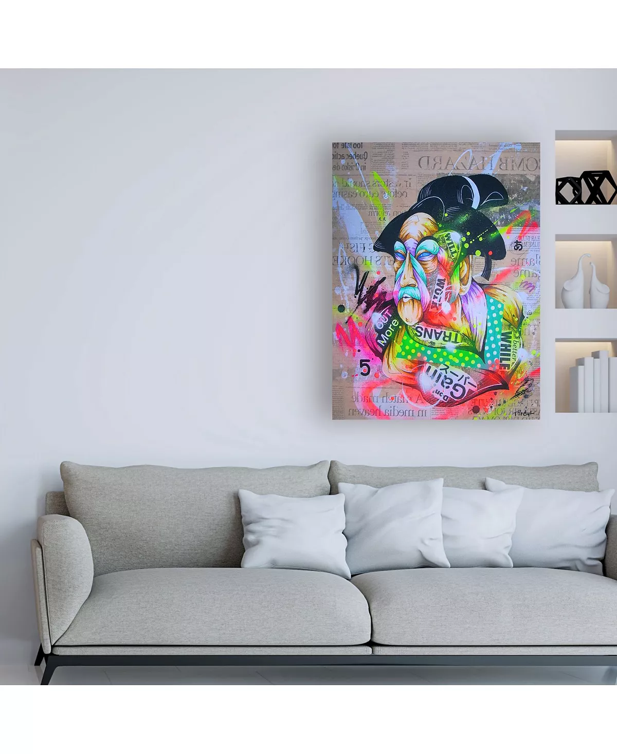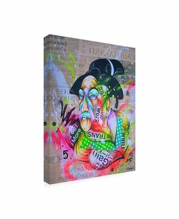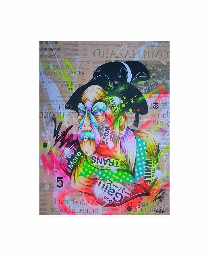 This ready to hang, gallery-wrapped art piece features a colorful abstract portrait of a character in the center of the frame. Gallery-wrap is a method of wrapping an artist’s canvas around a hidden, wooden frame allowing for a frameless presentation.