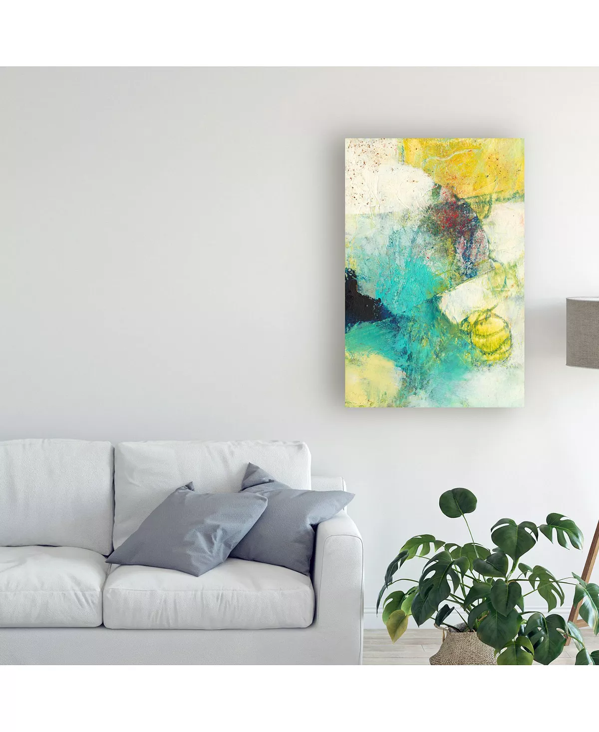 This ready to hang, gallery-wrapped art piece features blue and yellow paint over an abstract background. Gallery-wrap is a method of wrapping an artist’s canvas around a hidden, wooden frame allowing for a frameless presentation.