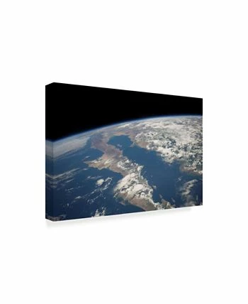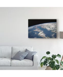 This ready to hang, gallery-wrapped art piece features the earth under black space. Gallery-wrap is a method of wrapping an artist’s canvas around a hidden, wooden frame allowing for a frameless presentation.